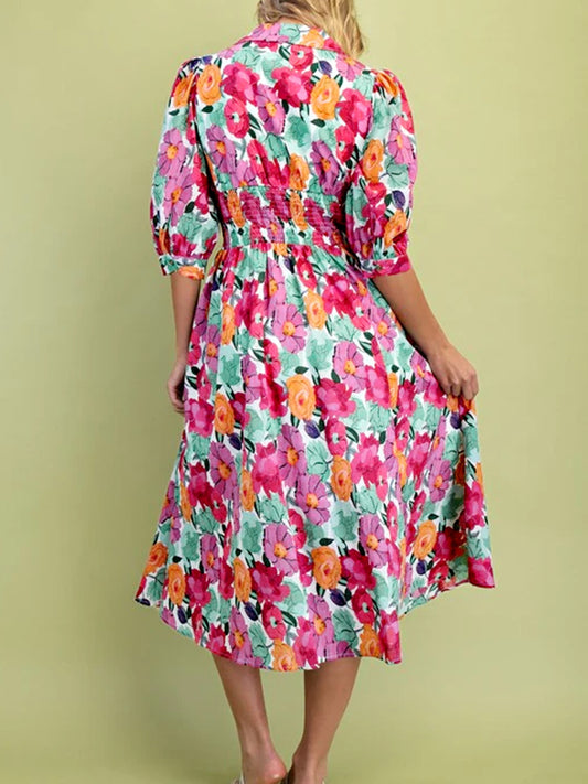 Vibrant Floral Print V Neck Zip Up Puffy Half Sleeve Dress