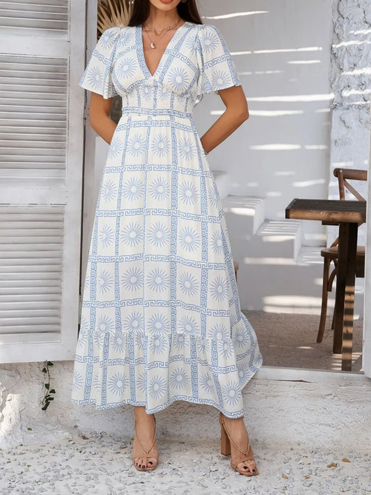 Devine Smocked Printed V-Neck Short Sleeve Maxi Dress