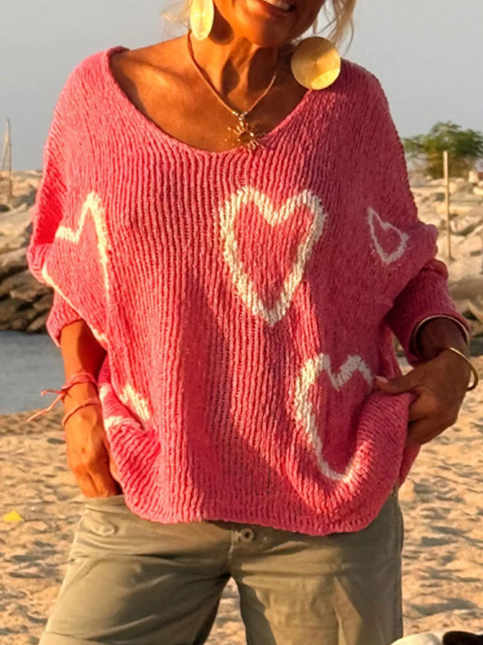 Heart V-Neck Dropped Shoulder Sweater