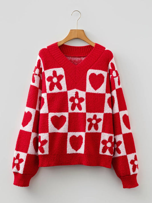 Floral Heart Checkered V-Neck Sweater